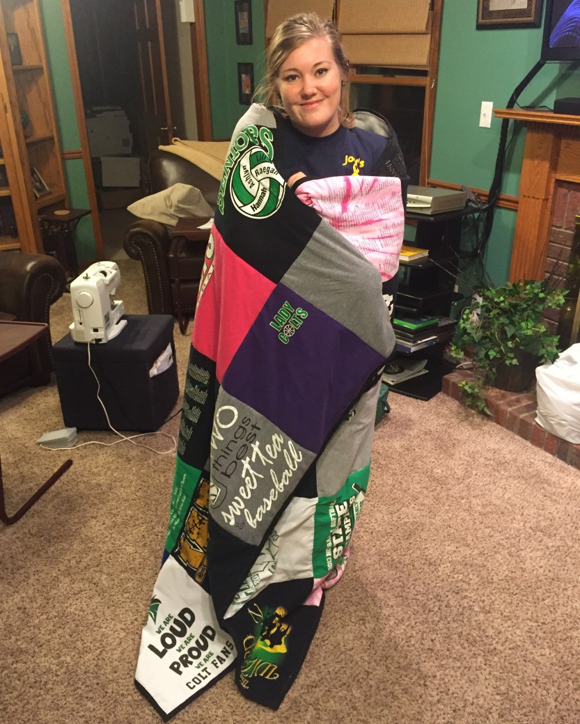 So, I finished the t-shirt quilt with a week to spare before heading back to school. It proudly sits on my bed and it is extremely warm. When I look at each square on my blanket, I am reminded of the event from each T-shirt. I selected t-shirts from high school, middle school, sport teams, and theater. I purposely chose shirts from phenomenal memories as well as ones I would be absolutely okay with never reliving again. I wanted my quilt to represent my life, and that includes the times that made me stronger as a person.