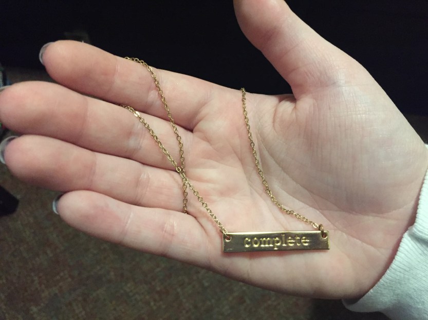 It’s a simple gold chain with one word printed on a rectangle plate: complete.